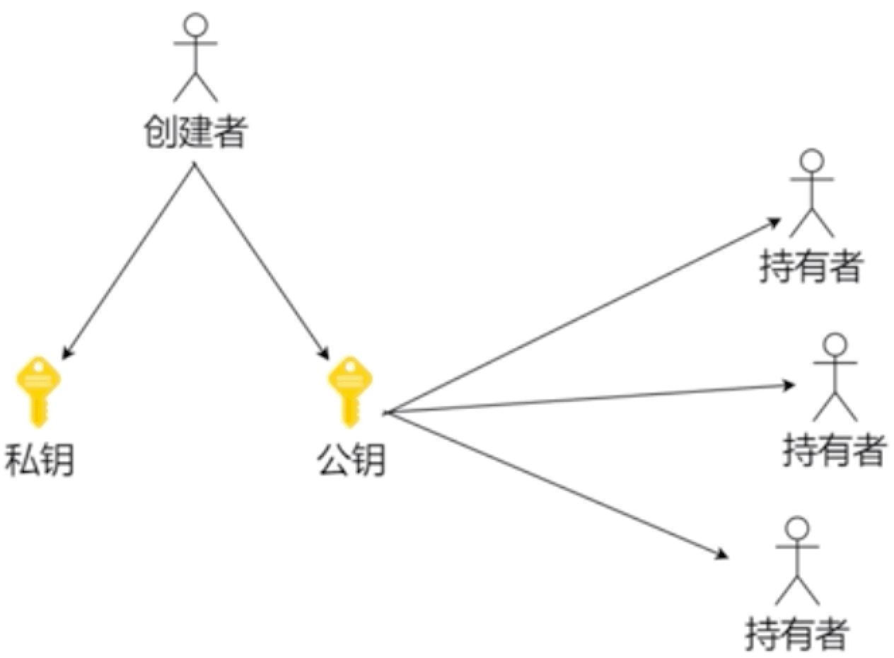 - 创建者创建一个秘钥对(分成公钥和私钥)
