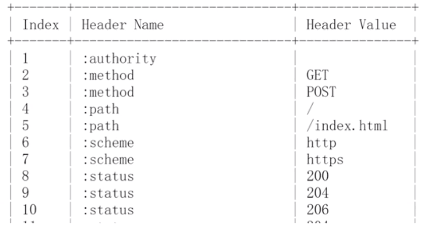 例如:METHOD GET 用2表示,就是我用2去表示METHOD GET,这样不就小了,这样压缩比率非常大,可以参考下面表代表Header压缩后的字符。